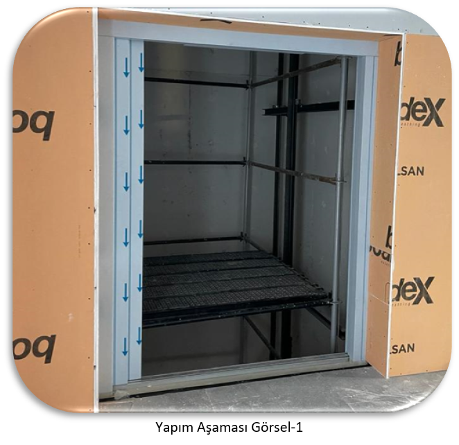 Asansör kabininde transpalet ile yük taşınan, kabinin üç duvarında paslanmaz küpeşte veya koruyucu bant paneller olan ve kabin kapı eşiği yük giriş çıkışına uygun mukavemete sahip olan iki adet asansör yapılmıştır.
