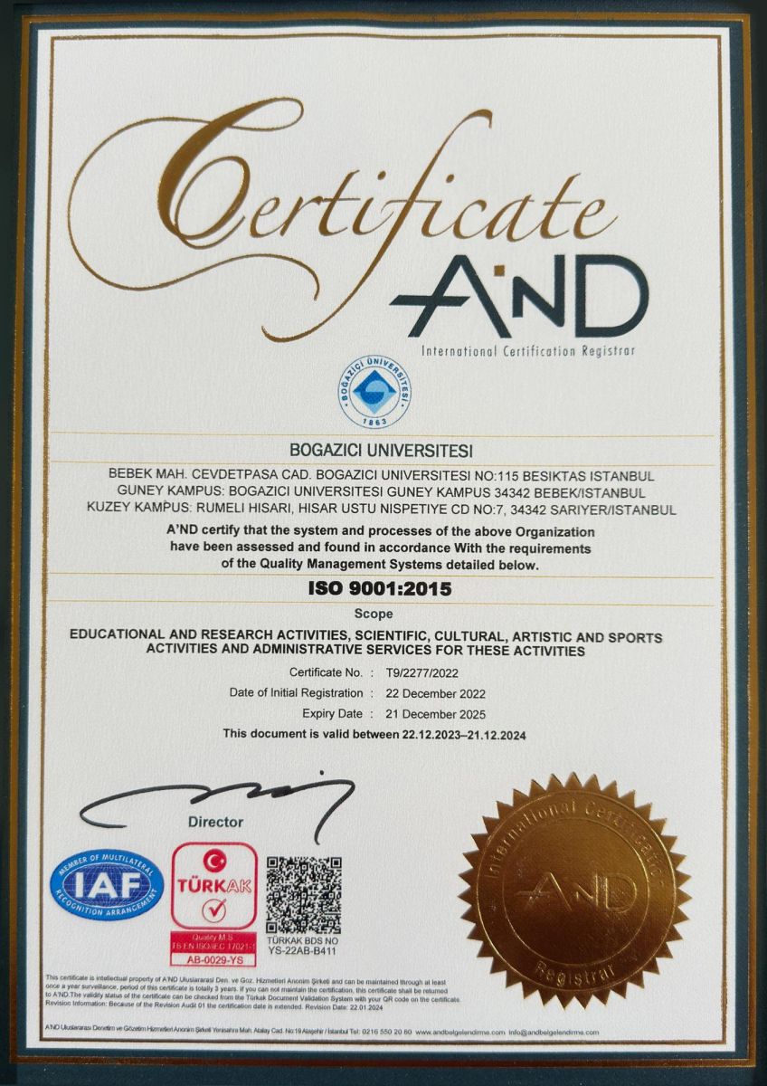 Boğaziçi Üniversitesi, Uluslararası Standardizasyon Kuruluşunun (ISO) her 5 yılda bir standartları gözden geçirip ihtiyaçlar doğrultusunda revize ettiği ISO 9001-2015 Kalite Yönetim Sistemi ve ISO 50001-2018 Belgelerini aldı.